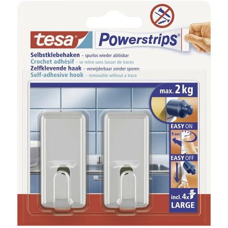 Les crochets de tesa Powerstrips® maintiennent solidement des charges jusqu’à 2 kg. Convient pour le collage sur les carreaux, le verre, le bois et la plupart des plastiques. Cette force de maintien maximale est obtenue sur des supports propres, lisses et fermes.
