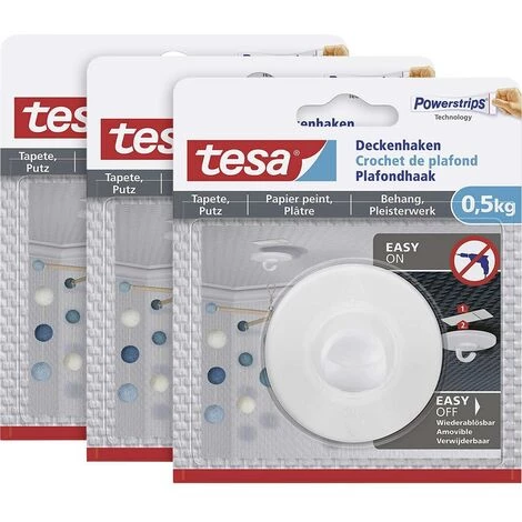 Crochet de plafond tesa pour papiers peints et plâtre – suspendre Mobileé sans percer le crochet de plafond auto-adhésif tesa est une alternative intelligente aux vis ou vis à oeillet. Au lieu de percer ou de marteler, collez le crochet au plafond rapidement et facilement. Grâce à la technologie tesa Powerstrips, le crochet offre une puissance de maintien allant jusqu’à 0, 5 kg. Vous ne risquez pas d’endommager le support, vous pouvez retirer à tout moment le crochet adhésif sans laisser de traces et même le réutiliser avec un nouveau Powerstrip. Le crochet de plafond blanc est Ideal pour accrocher en toute sécurité des objets mobiles et autres objets décoratifs sur des papiers peints et des plâtre. Son anneau de suspension peut être tourné. EASY on : nettoyez la surface à l’aide d’un chiffon sec et non poussiéreux. Appuyez sur la bande de manière complète et aussi uniforme que possible et fermement sur le support pendant au moins 5 secondes. Le côté bleu de la façade doit être orienté vers le mur. Retirez la plaque de base transparente du crochet de plafond et appuyez sur la bande adhésive pendant au moins 5 secondes. Placez maintenant le crochet sur la plaque et déplacez-le latéralement jusqu’à ce qu’il s’enclenche. Remarques : poser d’abord des bandes adhésives sur le support. Ne touchez pas les surfaces de collage. Le crochet adhésif n’est pas adapté aux surfaces avec revêtement anti-adhésif, par exemple lorsque la peinture anti-taches a été utilisée. EASY OFF : détachez le crochet de plafond de la plaque de base en le déplaçant latéralement. Maintenez la plaque de base en place sans l’appuyer sur le plafond. Saisissez la bande sur le dessus et retirez-la lentement d’environ 25 cm (pas vers le bas ou sur le côté) parallèlement au plafond. Remarque : un retrait non parallèle ou trop rapide peut entraîner la déchirure de la bande adhésive ou des dommages sur le support. CONTENU PAR MULTIPACK : 3 x crochets adhésifs pour le plafond avec 9 Powerstrips Ce texte a été traduit par une machine.