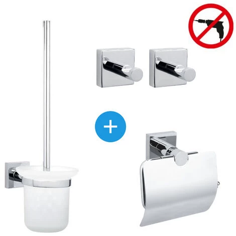 Laissez vous tenter par la simplicité d’installation du set Dérouleur de papier toilette avec couvercle + Brosse WC + 2 Crochets serviettes, pose facile sans perçage, Chrome, Tesa Hukk (40247-QUADRIOTESA)